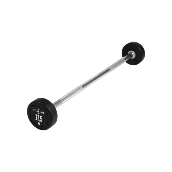 TITAN LIFE PRO Barbell er en vægtstang med fast vægt, som både kan bruges til at træne biceps og triceps. Vægtenheden er svejset fast til vægtstangen og beklædt med polyurethan. Den er egnet til træningscenteret, foreningsfitness mm. Fordelen med en vægtstang med fast vægt er, at der ikke skal bruges tid på udskiftning af vægtskiver, samt at vægtstørrelser har et spring på 5 kg. fra 10 – 45 kg.