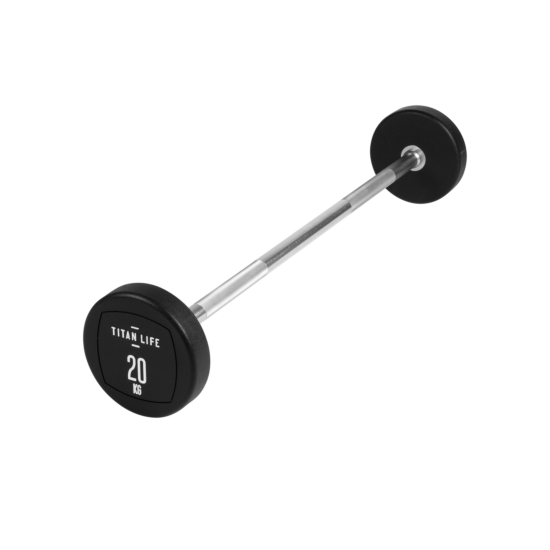 TITAN LIFE PRO Barbell er en vægtstang med fast vægt, som både kan bruges til at træne biceps og triceps. Vægtenheden er svejset fast til vægtstangen og beklædt med polyurethan. Den er egnet til træningscenteret, foreningsfitness mm. Fordelen med en vægtstang med fast vægt er, at der ikke skal bruges tid på udskiftning af vægtskiver, samt at vægtstørrelser har et spring på 5 kg. fra 10 – 45 kg.