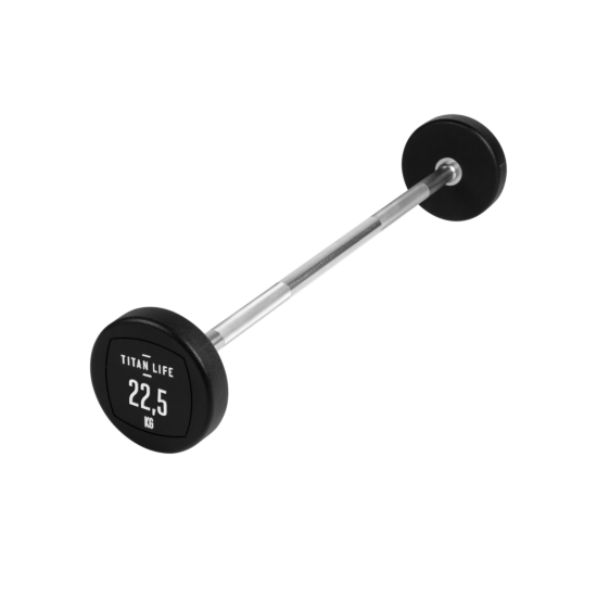 TITAN LIFE PRO Barbell er en vægtstang med fast vægt, som både kan bruges til at træne biceps og triceps. Vægtenheden er svejset fast til vægtstangen og beklædt med polyurethan. Den er egnet til træningscenteret, foreningsfitness mm. Fordelen med en vægtstang med fast vægt er, at der ikke skal bruges tid på udskiftning af vægtskiver, samt at vægtstørrelser har et spring på 5 kg. fra 10 – 45 kg.